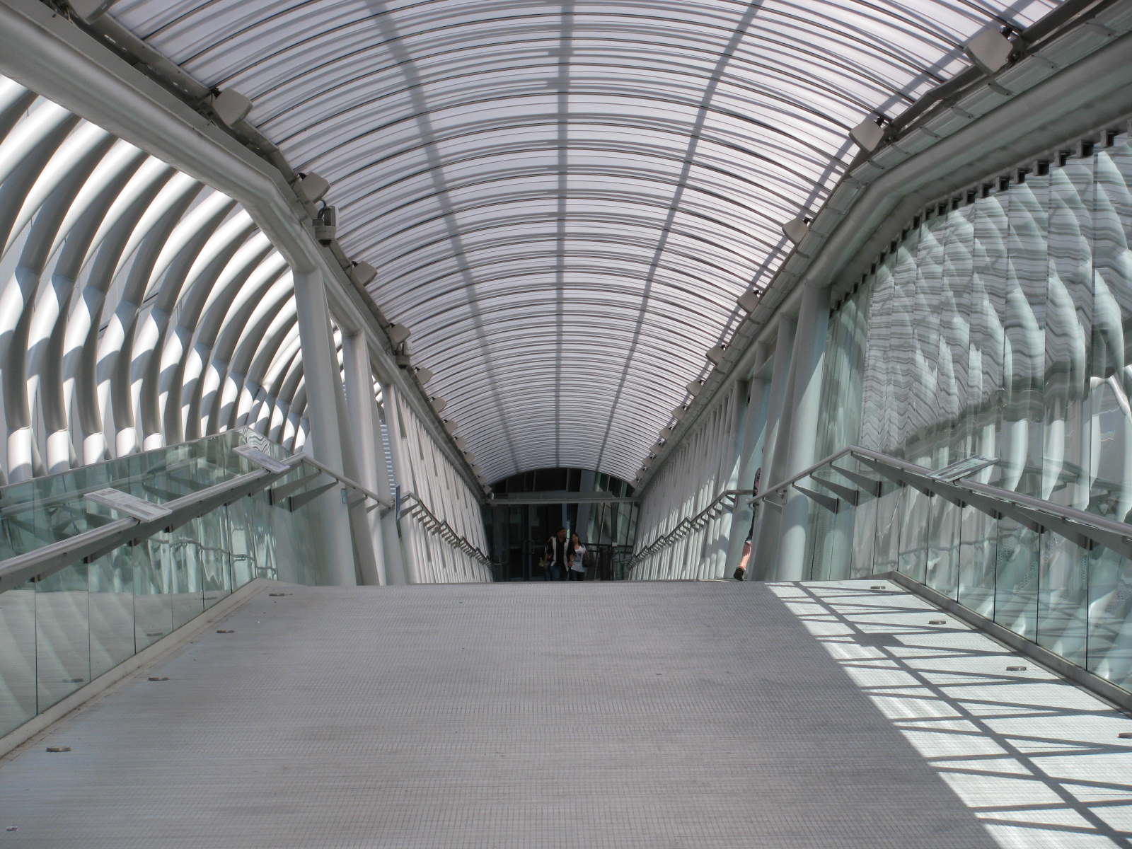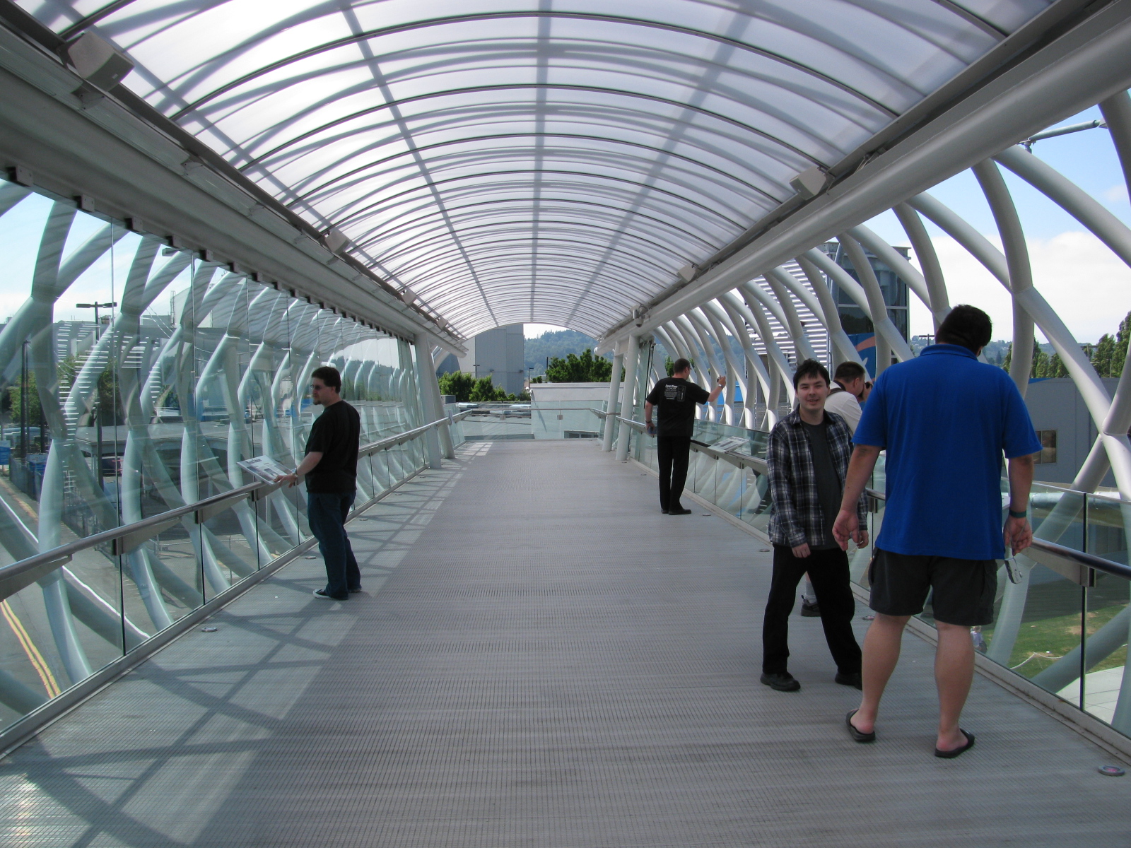 A bridge across the street to a lot in which airplanes are parked and you can walk through and see them from inside.