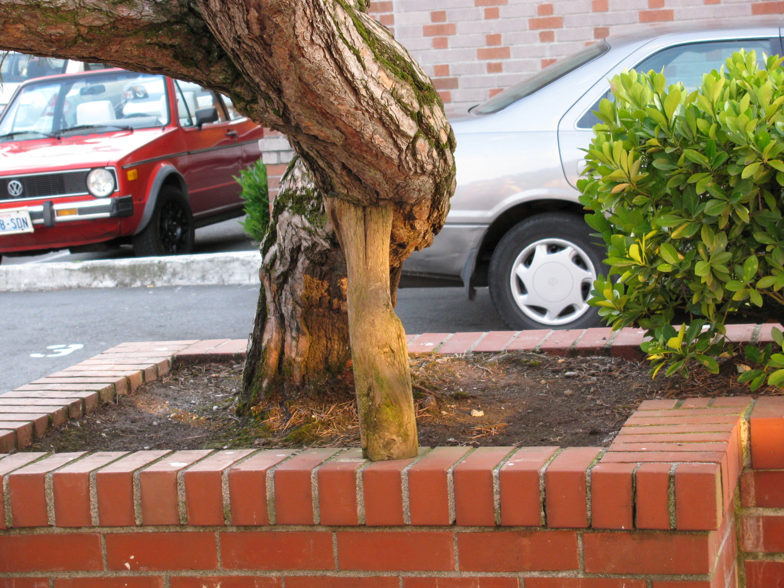 A tree propped up by a chunk of wood from its dead brethren. How morbid! Sort of like if you sat in an armchair made of real arms.