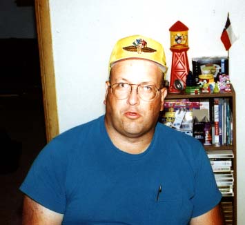 Lou Leghorn at the Stable (Vakko's house), sitting in front of a small bookcaselike thing holding various A!-related merchandise.