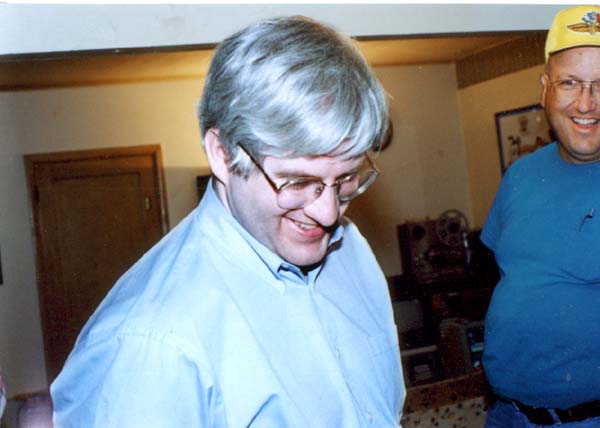 Michael reacts to seeing his birthday cake, as Chicken Lou looks on.