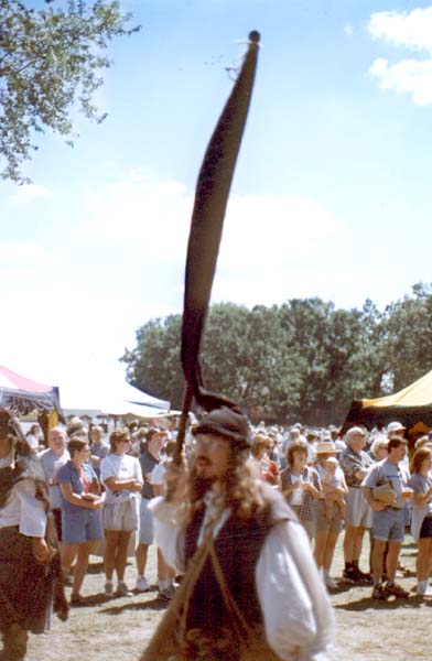 A man wearing a very long hat; so long it has to be held up by a pole.