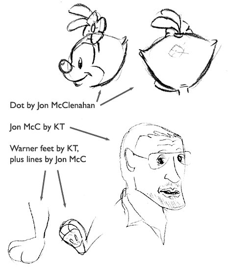 - A page of sketches we did, including Dot's head (plus the spurious "third tuft" Sheila asked about) and a caricature by me of Jon McClenahan.