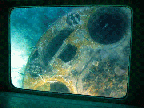 The wreck of the Mahoney, seen through the glass bottom of the boat.