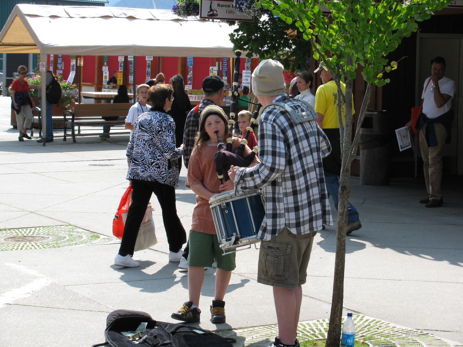 Buskers outside the Tramway building, playing bagpipes and drum.
